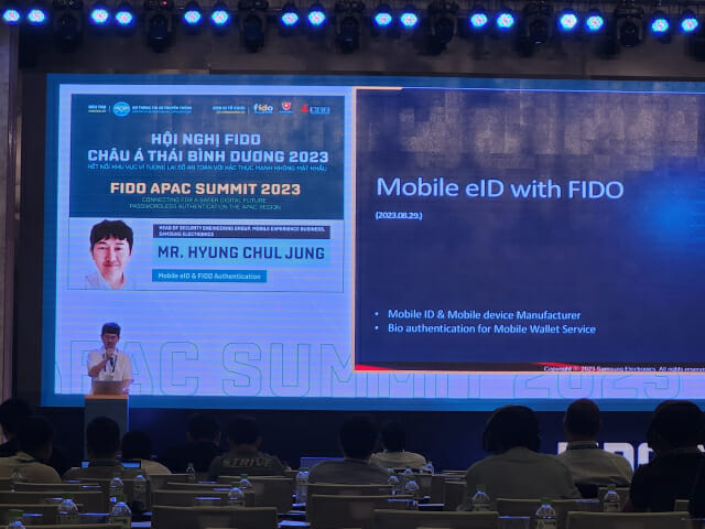 [나트랑(베트남)=김윤희 기자]지갑 속에 보관하던 멤버십 카드나 쿠폰, 신용카드와 신분증까지 휴대폰으로 대체할 수 있게 되는 등 모바일 전자신분증(eID) 솔루션이 확산되는 가운데, 대중화만큼 보안 수준 향상 또한 중요하다는 조언이 나왔다.정형철 삼성전자 MX사업부 시큐리티팀 그룹장은 29일 베트남 나트랑에서 열린 '패스트아이덴티티온라인(FIDO) APAC 서밋 2023' 현장에서 이같은 취지의 발표를 했다.